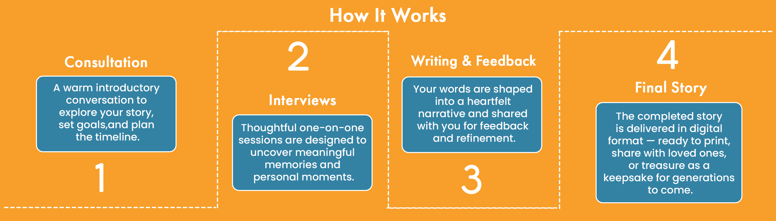 Our process is warm, collaborative, and human-centric. You will always be dealing with a person, not a machine. We guide you through storytelling with empathy and skill, ensuring your memories, values, and experiences are captured truthfully and clearly. Every story is handled with care, confidentiality, and respect.